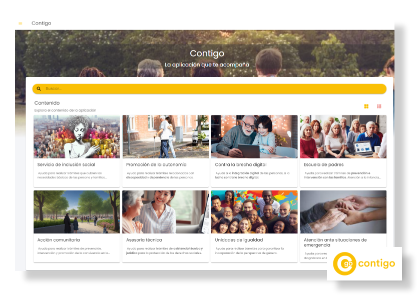 Contigo es una plataforma integral para la ciudadanía que facilita el acceso a información y asistencia sobre trámites, ayudas y solicitudes de la administración pública. La plataforma ofrece tutoriales paso a paso, ayuda para superar la brecha digital y funciona como una red social jerárquica donde los usuarios colaboran entre sí, con aquellos de mayor nivel aportando información y tutoriales.